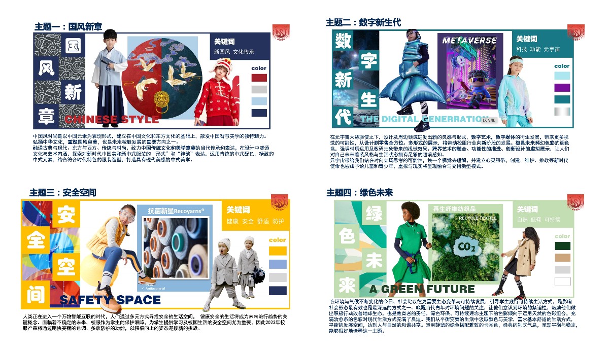 在演講中,尚德服飾圍繞健康舒適、科技賦能、綠色時尚,文化傳承這四方面,提出了“安全空間”、“數(shù)字新生代”、“綠色未來”和“國風新章”四大主題新趨向,展示了其對未來校服設計的獨特見解。