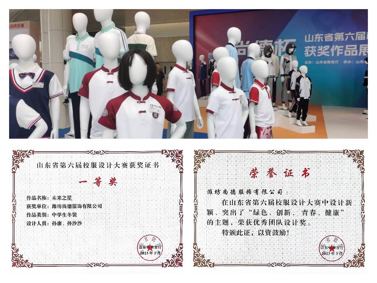 隨著研發(fā)、制造等過程的不斷投入,公司創(chuàng)新產(chǎn)品持續(xù)迭出,獲獎作品不斷涌現(xiàn)。在此次展會開幕式現(xiàn)場的一側,同步舉行的“山東省第六屆校服設計大賽”獲獎作品展示中,尚德服飾以一等獎一個,二等獎兩個,三等獎三個及優(yōu)秀團隊獎一個,成為現(xiàn)場矚目的明星企業(yè)。